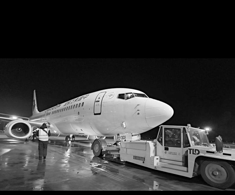 太原机场二跑道上,客机在等待牵引车作业。