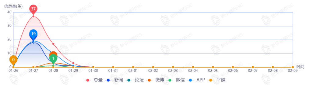 截至目前,该文章在互联网上传播总量57篇。其中1月27日是传播的高峰期,共传播37篇文章。各信源的信息发布情况中,app信息占比最大,其次是新闻和微博,占比分别为52.63%、38.60%、7.02%。(数据来源:新华睿思数据云图分析平台)