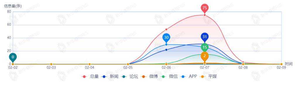 截至目前,该文章在互联网上传播总量131篇。其中2月7日是传播的高峰期,共传播75篇文章。各信源的信息发布情况中,app信息占比最大,其次是新闻和微信,占比分别为42.75%、41.22%、12.98%。(数据来源:新华睿思数据云图分析平台)