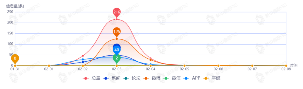截至目前,该文章在互联网上传播总量307篇。其中2月3日是传播的高峰期,共传播216篇文章。各信源的信息发布情况中,新闻微博占比最大,其次是app和新闻,占比分别为54.08%、27.80%、18.12%。(数据来源:新华睿思数据云图分析平台)
