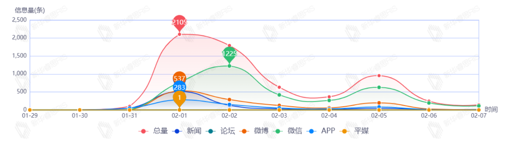 截至目前,该文章在互联网上传播总量3715篇。其中2月1日是传播的高峰期,共传播2105篇文章。各信源的信息发布情况中,微信占比最大,其次是微博和app,占比分别为43.06%、37.04%、12.96%。(数据来源:新华睿思数据云图分析平台)