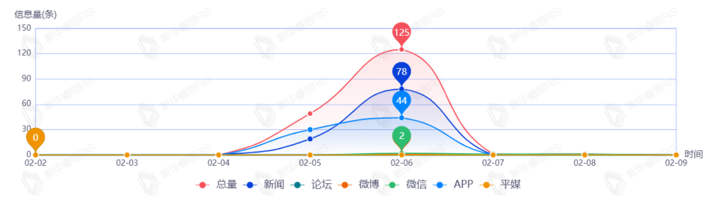 截至目前,该文章在互联网上传播总量214篇。其中2月6日是传播的高峰期,共传播125篇文章。各信源的信息发布情况中,新闻信息占比最大,其次是app,占比分别为52.73%、47.27%。(数据来源:新华睿思数据云图分析平台)