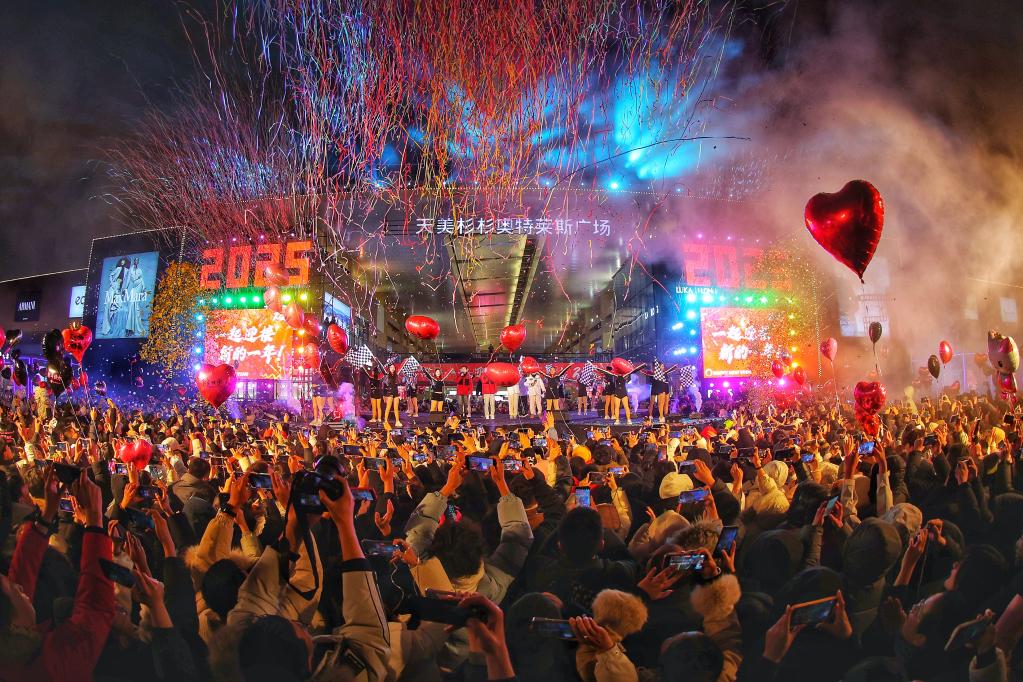 “五、四、三、二、一!”晋中天美杉杉奥特莱斯购物广场的88台高空礼炮喷射彩带,将跨年夜的氛围引至高潮。