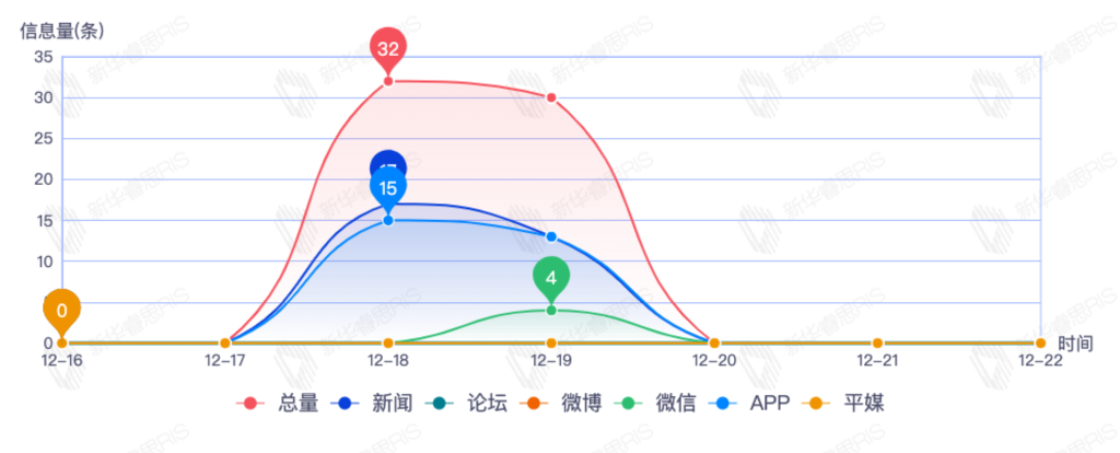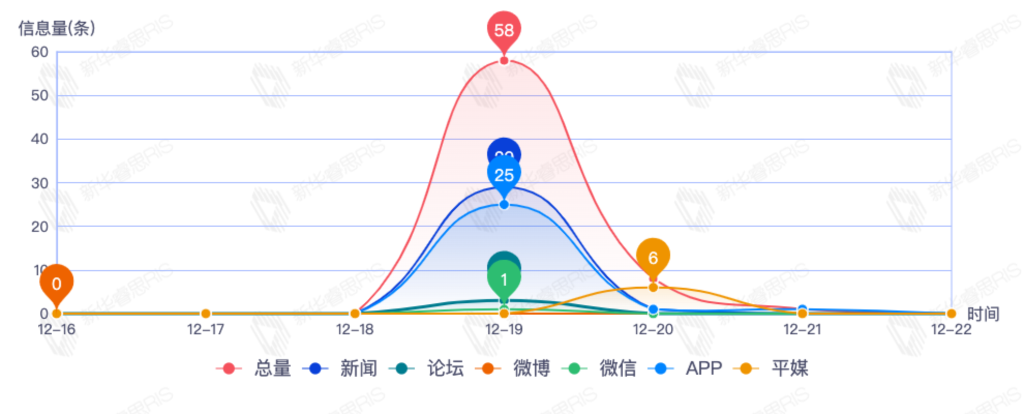 截至目前,该文章在互联网上传播总量492篇。其中12月21日是传播的高峰期,共传播362篇文章。各信源的信息发布情况中,新闻信息占比最大,其次是app和微信,信息量分别为181、177、73,占比分别为39.09%、38.23%、15.77%。(数据来源:新华睿思数据云图分析平台)