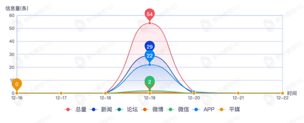 截至目前,该文章在互联网上传播总量151篇。其中12月19日是传播的高峰期,共传播89篇文章。各信源的信息发布情况中,app信息占比最大,其次是新闻和平媒,信息量分别为58、54、8,占比分别为43.94%、40.91%、6.06%。(数据来源:新华睿思数据云图分析平台)
