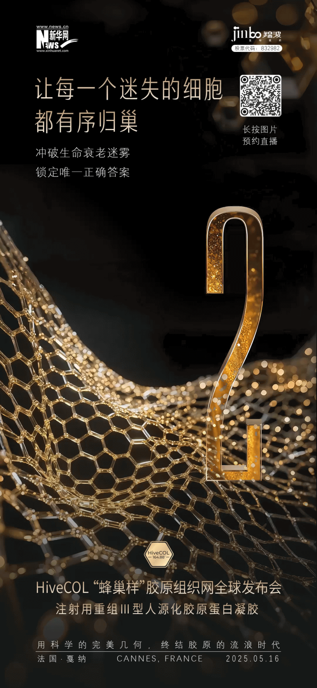 锦波生物将于第78届戛纳电影节“2025芭莎戛纳之夜”活动期间,正式发布“全球新·中国造”原创科技——hivecol“蜂巢样”胶原组织网新技术。这项技术实现了哪些突破?有哪些显著优势?如何为美丽与健康赋能?5月16日,让我们共同关注。