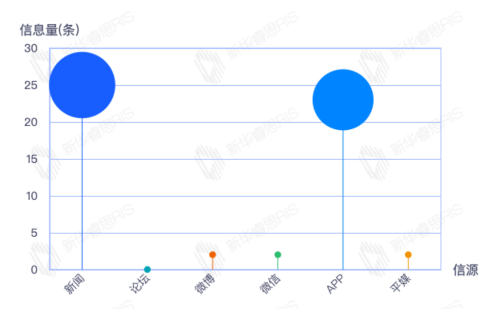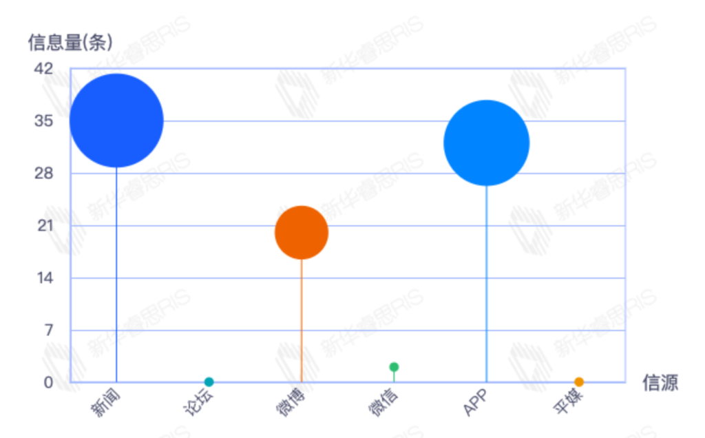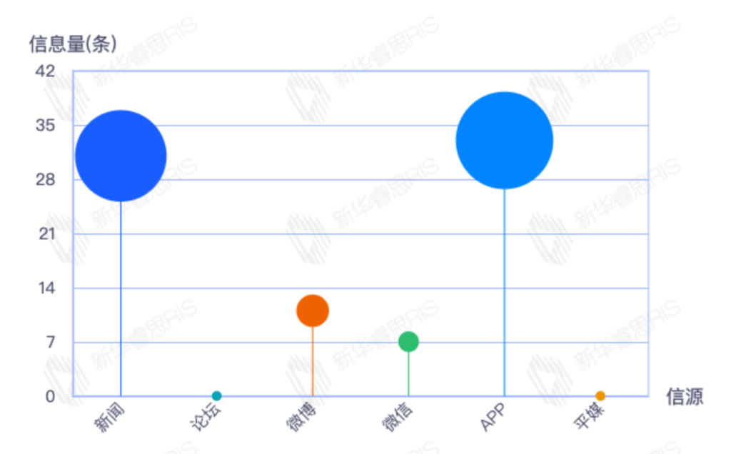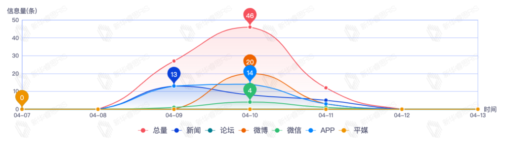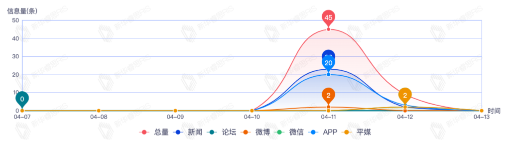 截至目前,该文章在互联网上传播总量54篇。其中4月11日是传播的高峰期,共传播45篇文章。各信源的信息发布情况中,新闻信息占比最大,其次是app和平媒,信息量分别为25、23、2,占比分别为46.30%、42.59%、3.70%。(数据来源:新华睿思数据云图分析平台)