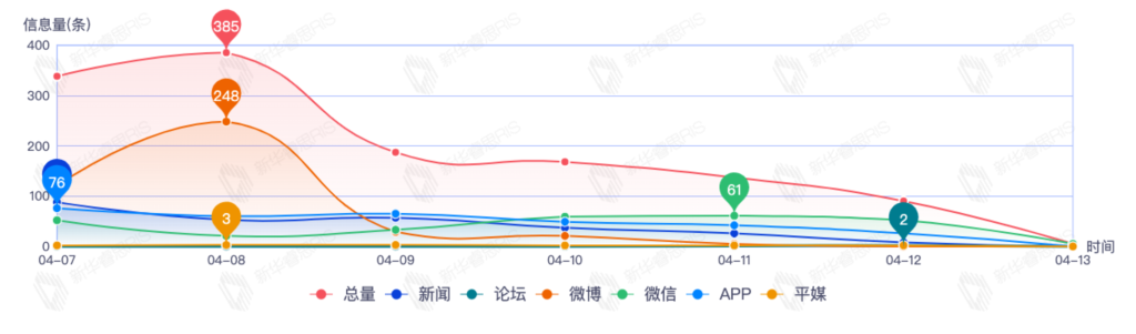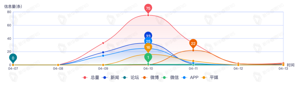 截至目前,该文章在互联网上传播总量140篇。其中4月11日是传播的高峰期,共传播64篇文章。各信源的信息发布情况中,app信息占比最大,其次是新闻和平媒,信息量分别为63、40、30,占比分别为45.00%、28.57%、21.43%。(数据来源:新华睿思数据云图分析平台)