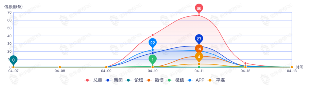 截至目前,该文章在互联网上传播总量112篇。其中4月11日是传播的高峰期,共传播66篇文章。各信源的信息发布情况中,新闻信息占比最大,其次是app和微博,信息量分别为46、44、16,占比分别为41.07%、39.29%、14.29%。(数据来源:新华睿思数据云图分析平台)
