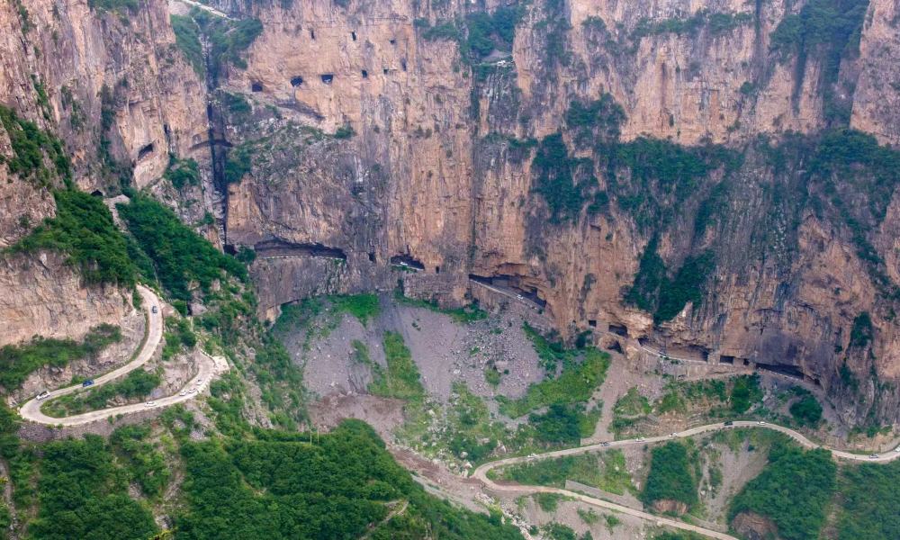 山西省晋城市陵川县王莽岭景区讲解员张佳佳告诉记者,锡崖沟村为走出“绝地之困”,1962年起,村里三代人接续奋斗三十载,在头上壁立千仞、脚下万丈深渊的悬崖峭壁上,用钢钎、铁锤等工具在北边的王莽岭绝壁上凿出了一条明明暗暗高差达600米、7.5公里长的挂壁公路。这是乡村筑路史上的奇观,也是刻画太行精神的人文景观。