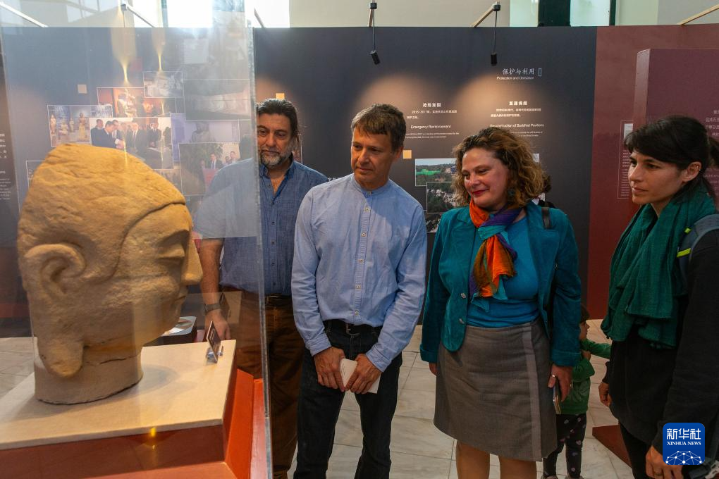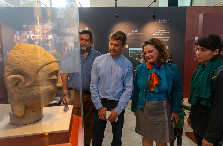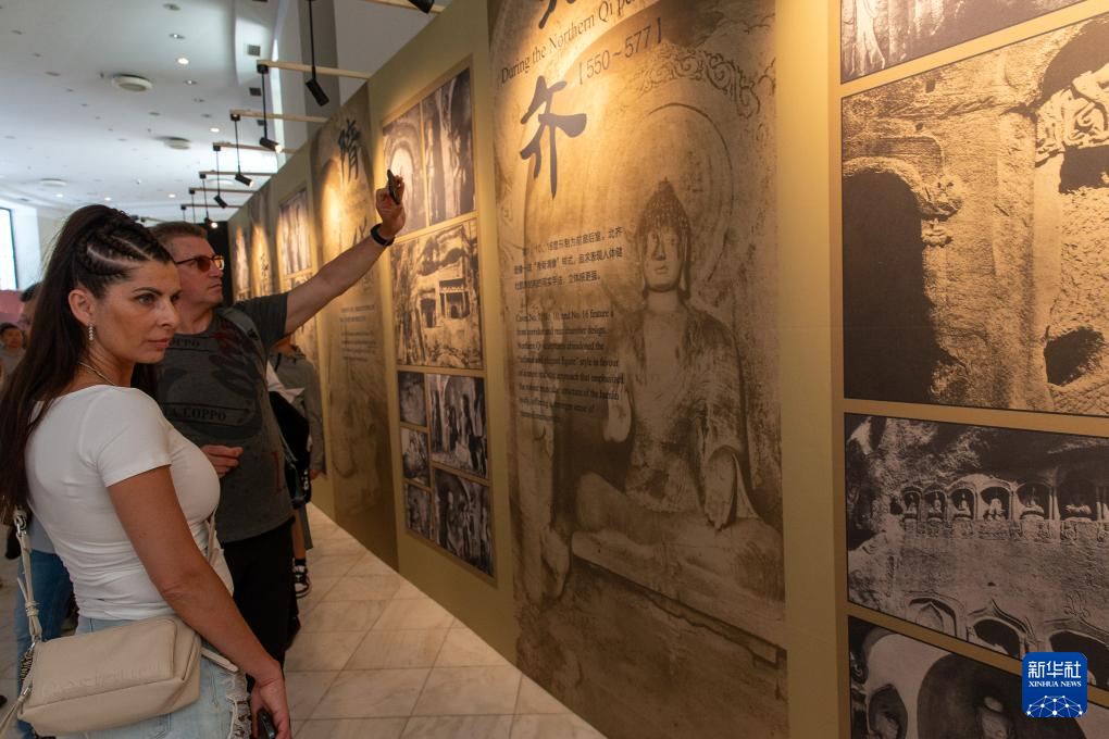5月11日,参观者在希腊雅典扎皮翁宫观看中国石窟艺术介绍。