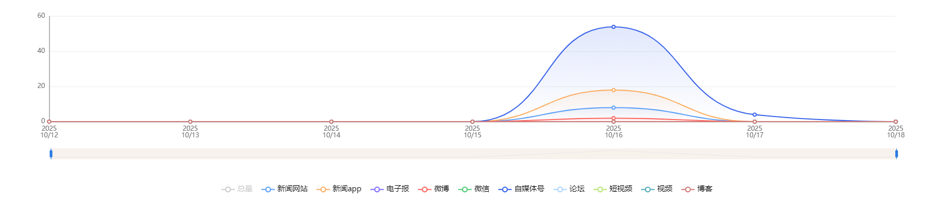截至目前,该文章在互联网上传播总量共16篇。各信源的信息发布情况中,自媒体号占比最大,其次是微博。(数据来源:新华睿思·数媒智慧分析平台)