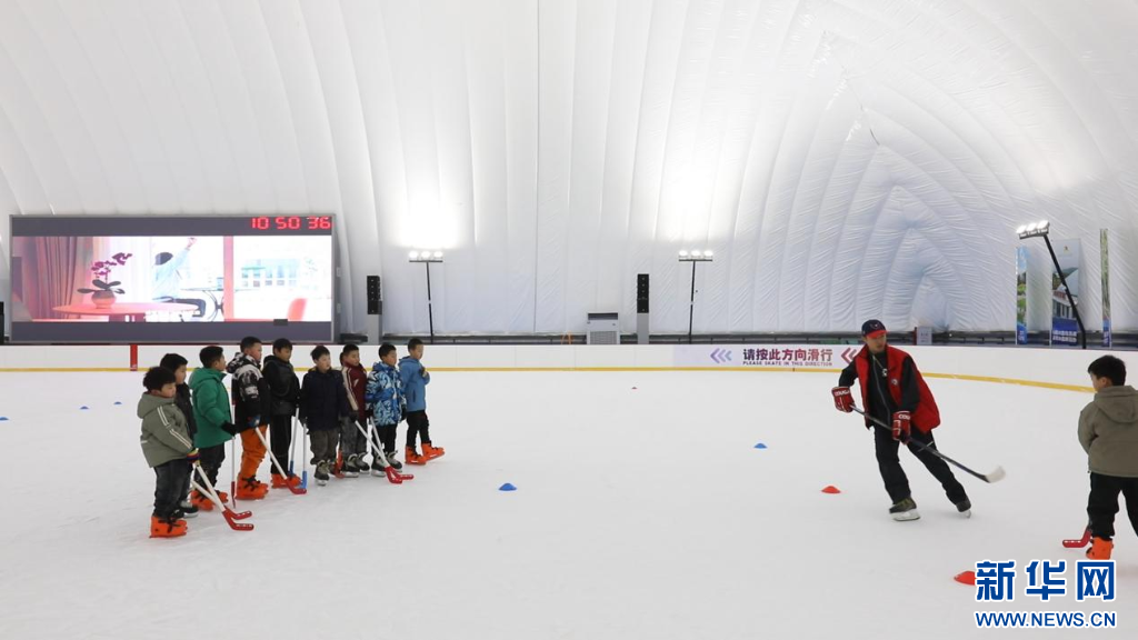王营庄气膜滑冰馆内,教练带领孩子们在练习冰球。新华网 发(陈慧忠 摄)