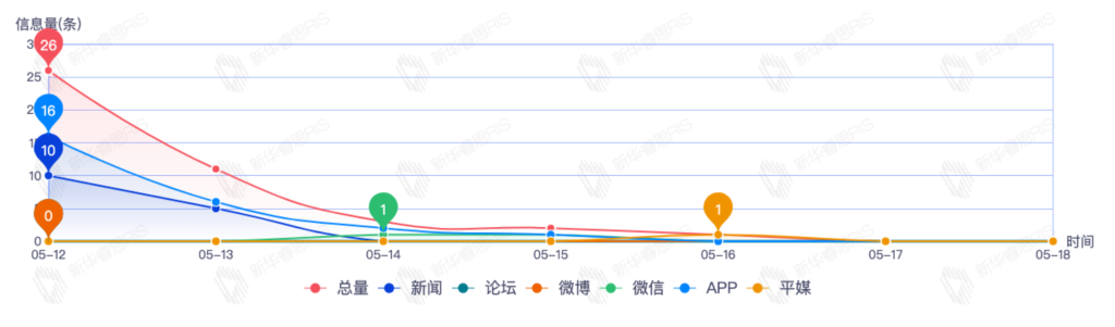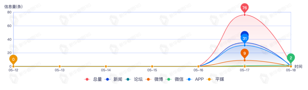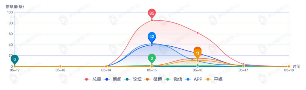 截至目前,该文章在互联网上传播总量共151篇。其中,5月15日是传播的高峰期,共传播85篇文章。各信源的信息发布情况中,新闻信息占比最大,其次是app和微博,信息量分别为64、54、13,占比分别为43.54%、36.73%、8.84%。(数据来源:新华睿思·数媒智慧分析平台)