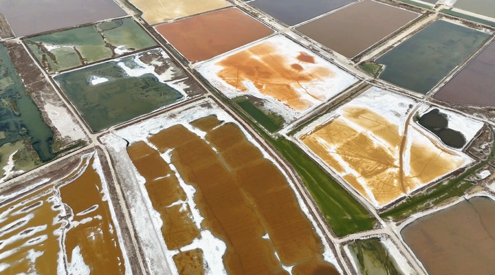 连日来,随着气温持续升高,位于山西南部的运城盐湖呈现出色彩斑斓的景象,从空中俯瞰,如同一块块散落在大地上的调色盘。(新华社记者王皓)