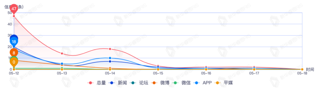 截至目前,该文章在互联网上传播总量共86篇。其中,5月12日是传播的高峰期,共传播47篇文章。各信源的信息发布情况中,app信息占比最大,其次是新闻和微博,信息量分别为36、34、8,占比分别为45.00%、42.50%、10.00%。(数据来源:新华睿思·数媒智慧分析平台)