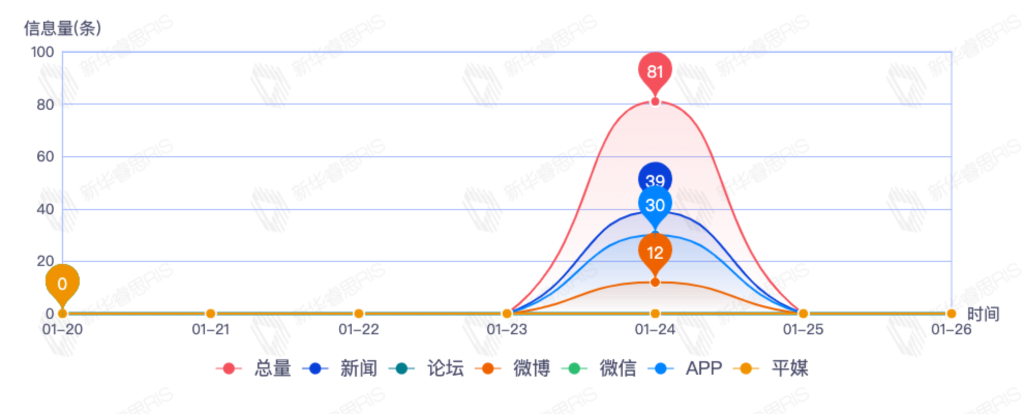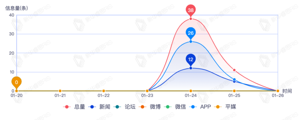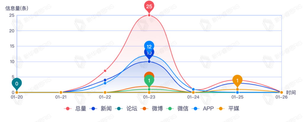 截至目前,该文章在互联网上传播总量共37篇。其中,1月23日是传播的高峰期,共传播25篇文章。各信源的信息发布情况中,新闻信息占比最大,其次是app和平媒,信息量分别为17、16、1,占比分别为47.22%、44.44%、2.78%。(数据来源:新华睿思·数媒智慧分析平台)