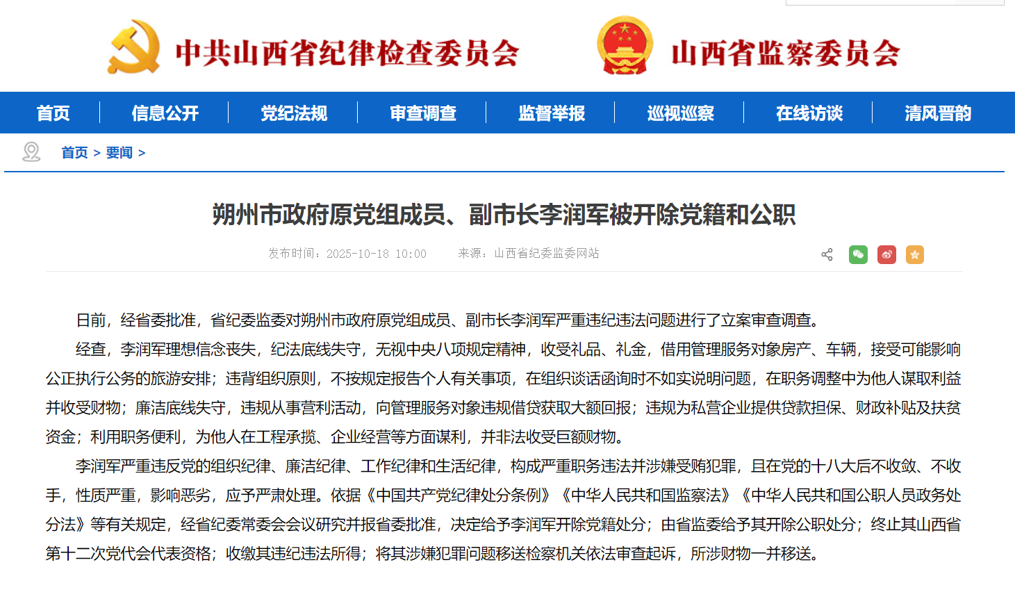 原标题:朔州市政府原党组成员、副市长李润军被开除党籍和公职