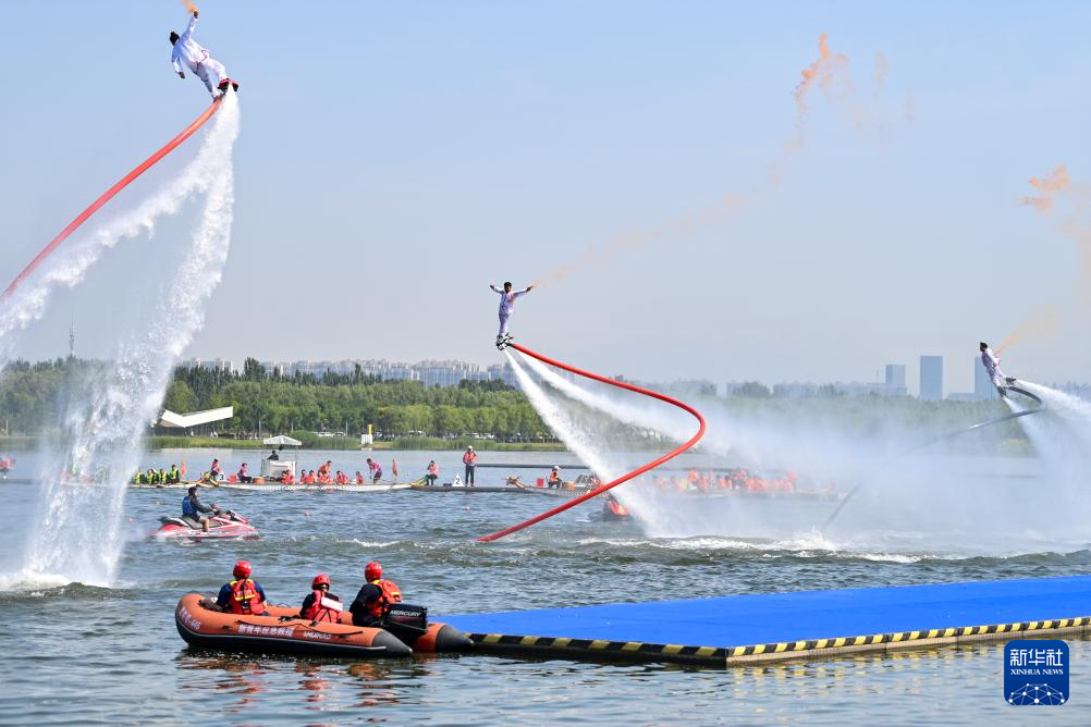 6月10日,演员在太原市水上运动中心进行“水上飞人”表演。