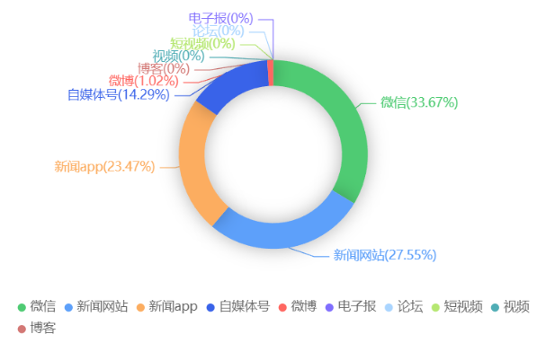 截至目前,该文章在互联网上传播总量共98篇。各信源的信息发布情况中,微信占比最高,其次是新闻网站。(数据来源:新华睿思数据云图分析平台)