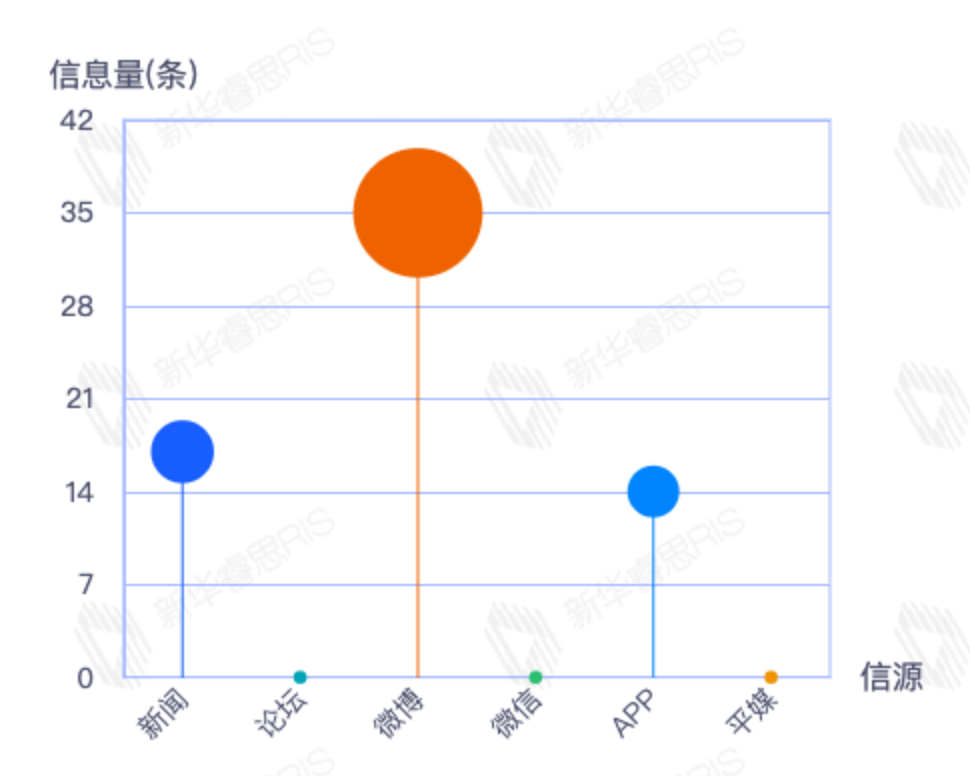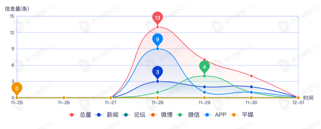 截至目前,该文章在互联网上传播总量35篇。其中11月25日是传播的高峰期,共传播11篇文章。各信源的信息发布情况中,新闻信息占比最大,其次是app和微信,信息量分别为15、11、6,占比分别为46.88%、34.38%、18.75%。(数据来源:新华睿思数据云图分析平台)