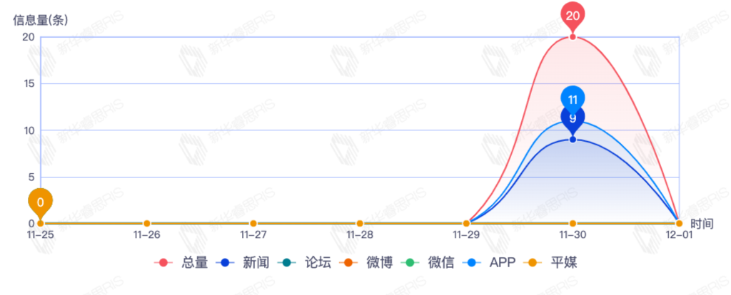 截至目前,该文章在互联网上传播总量20篇。其中11月30日是传播的高峰期,共传播20篇文章。各信源的信息发布情况中,app信息占比最大,其次是新闻,信息量分别为10、9,占比分别为52.63%、47.37%。(数据来源:新华睿思数据云图分析平台)