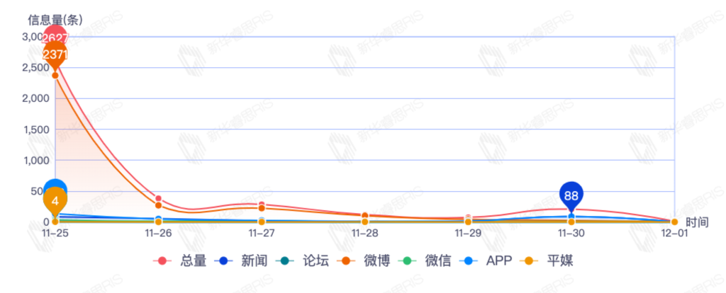 截至目前,该文章在互联网上传播总量3720篇。其中11月25日是传播的高峰期,共传播2627篇文章。各信源的信息发布情况中,微博信息占比最大,其次是新闻和app,信息量分别为3029、264、221,占比分别为84.12%、7.33%、6.14%。(数据来源:新华睿思数据云图分析平台)