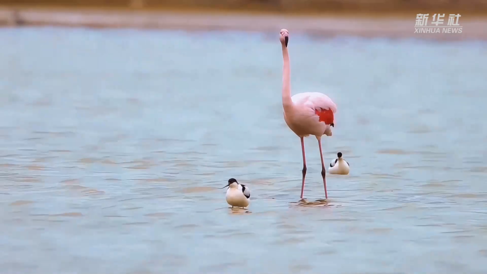 近日,在黄土高原上的山西运城盐湖,颜色鲜艳的火烈鸟在此停留,为冬日盐湖带来勃勃生机。(新华社记者王皓)