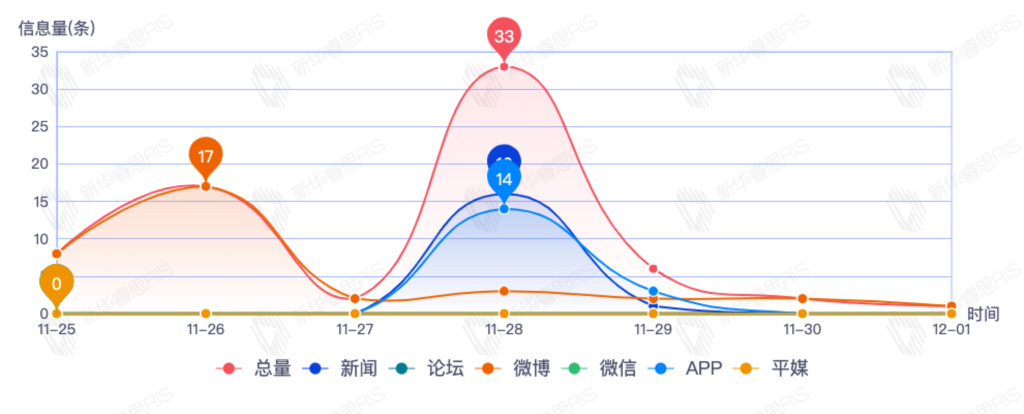 截至目前,该文章在互联网上传播总量331篇。其中11月26日是传播的高峰期,共传播149篇文章。各信源的信息发布情况中,新闻信息占比最大,其次是微信和app,信息量分别为105、93、72,占比分别为35.59%、31.53%、24.41%。(数据来源:新华睿思数据云图分析平台)