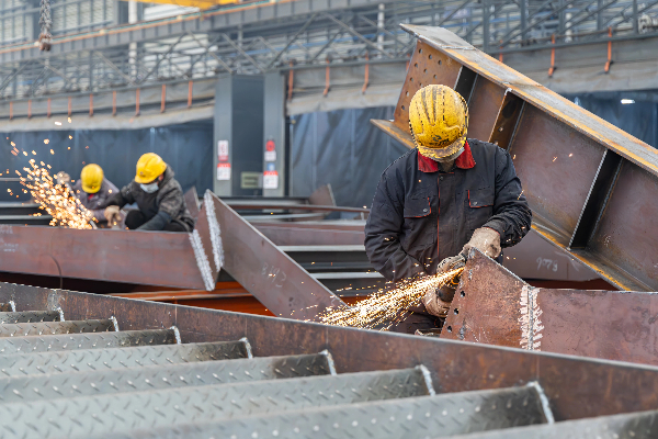 华兆东南(运城)绿色建筑集成有限公司生产车间内,工人在焊接、打磨钢结构部件。新华网发(兰立强摄)