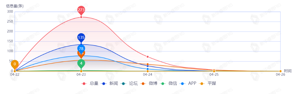 截至目前,该文章在互联网上传播总量352篇。其中4月23日是传播的高峰期,共传播273篇文章。各信源的信息发布情况中,新闻信息占比最大,其次是微博和app,占比分别为46.15%、27.07%、25.36%。(数据来源:新华睿思数据云图分析平台)