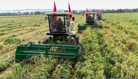 近日,山西省忻州市五寨县杂粮种植示范基地迎来谷子收获季,多台收割机、拣拾机往返于此,一派丰收景象。
