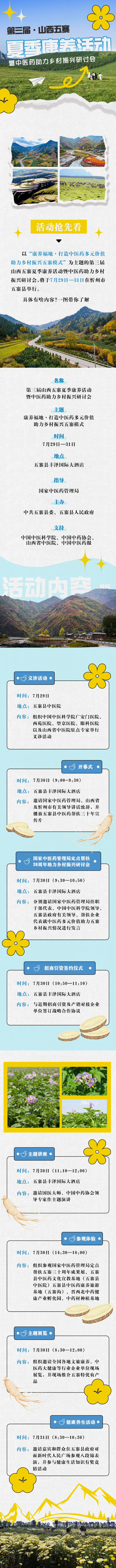 以“康养福地·打造中医药多元价值助力乡村振兴五寨模式”为主题的第三届山西五寨夏季康养活动暨中医药助力乡村振兴研讨会,将于7月29日—31日在忻州市五寨县举行。具体有啥内容?一图带你了解。