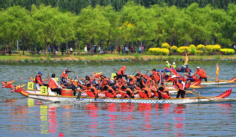 参赛队伍在 2024 太原汾河龙舟 公开赛比赛中(2024 年 6 月 10 日摄) 杨晨光摄 / 本刊