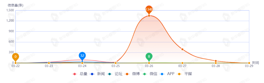 截至目前,该文章在互联网上传播总量共1653篇。其中,3月28日是传播的高峰期,共传播1420篇文章。各信源的信息发布情况中,微博信息占比最大,其次是app和新闻,占比分别为93.99%、3.10%、2.85%。(数据来源:新华睿思·数媒智慧分析平台)