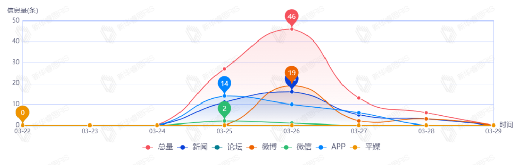 截至目前,该文章在互联网上传播总量共92篇。其中,3月26日是传播的高峰期,共传播46篇文章。各信源的信息发布情况中,新闻信息占比最大,其次是app和微博,占比分别为38.04%、32.61%、26.09%。(数据来源:新华睿思·数媒智慧分析平台)