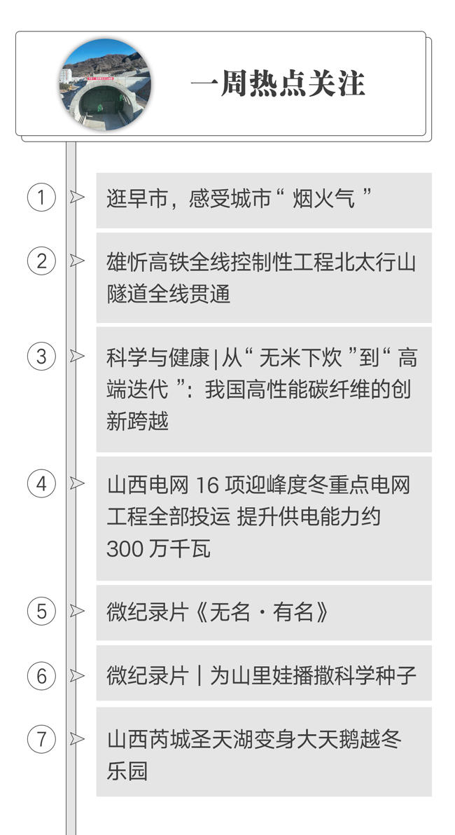 清晨,山西省体育场早市率先从城市中苏醒过来,热火朝天的早市,让寒风中的城市暖和了起来;山西云冈经开区清洁能源产业园,一条崭新的生产线发出低沉的轰鸣,卷绕机上,数万根细丝般的黑色纤维汇成一道道“乌亮河流”,这抹亮丽的黑色背后,是一场持久的材料创新攻坚;随着最后一次开挖爆破顺利完成,历经1113天的奋战,雄忻高铁全线控制性工程北太行山隧道实现全线贯通;山西省长治市黎城县通过科学鉴定与实地寻访双轨并行的方式,结合亲属叙述和烈士英名录记载,成功为3具烈士遗骸找到“回家路”……1月12日至18日,新华社记者访早市、到企业、进深山、入农家,积极踊跃奔赴基层一线,感受城市“烟火气”,看产业发展新脉动。