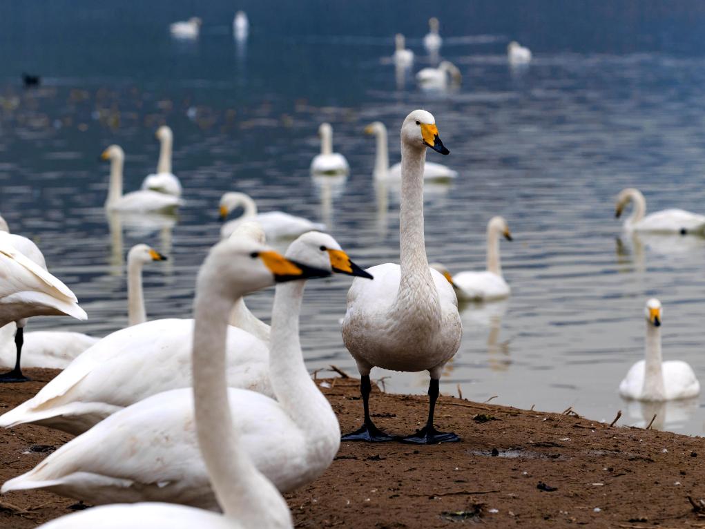 连日来,随着气温持续降低,飞抵山西省运城市芮城县圣天湖越冬的大天鹅数量已达数千只,成群结队的大天鹅在辽阔的水面上嬉戏玩闹,吸引众多游客前来观赏。(新华社记者王飞航)