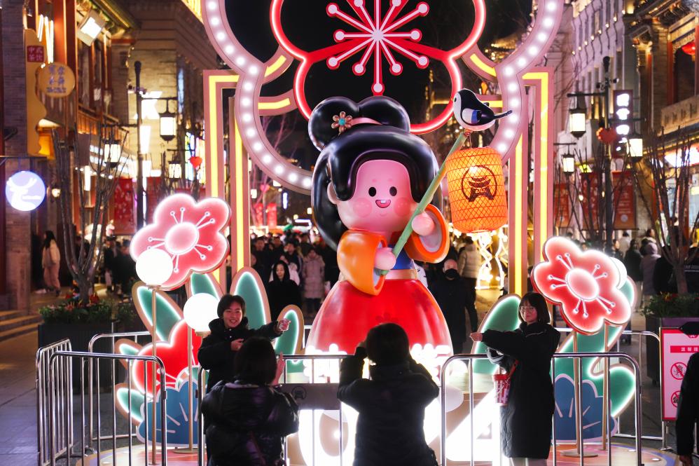 游客与钟楼步行街的新布景合影。新华社发(张昊宇摄)