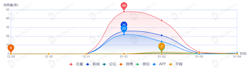截至目前,该文章在互联网上传播总量共89篇。其中,1月1日是传播的高峰期,共传播48篇文章。各信源的信息发布情况中,新闻信息占比最大,其次是app和平媒,占比分别为58.54%、36.59%、3.66%。(数据来源:新华睿思数据云图分析平台)