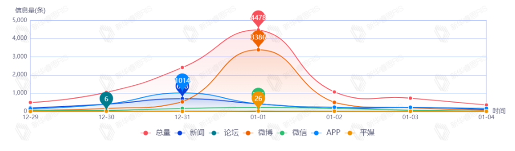 截至目前,该文章在互联网上传播总量共3847篇。其中,1月1日是传播的高峰期,共传播2412篇文章。各信源的信息发布情况中,微博信息占比最大,其次是app和新闻,占比分别为47.15%、23.42%、21.11%。(数据来源:新华睿思数据云图分析平台)