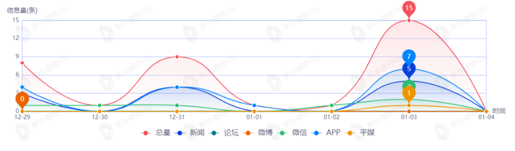 截至目前,该文章在互联网上传播总量共35篇。其中,1月3日是传播的高峰期,共传播15篇文章。各信源的信息发布情况中,app信息占比最大,其次是新闻和微信,占比分别为45.71%、34.29%、17.14%。(数据来源:新华睿思数据云图分析平台)