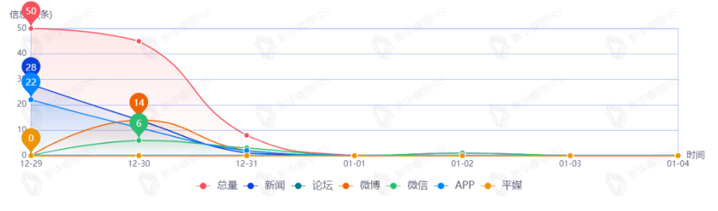 截至目前,该文章在互联网上传播总量共104篇。其中,12月29日是传播的高峰期,共传播50篇文章。各信源的信息发布情况中,新闻信息占比最大,其次是app和微博,占比分别为41.35%、33.65%、15.38%。(数据来源:新华睿思数据云图分析平台)