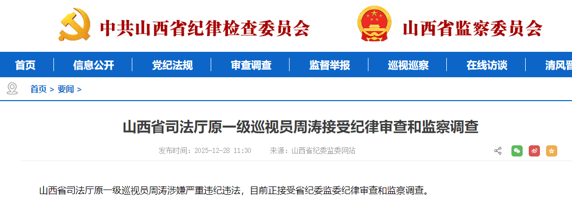 山西省司法厅原一级巡视员周涛涉嫌严重违纪违法,目前正接受省纪委监委纪律审查和监察调查。